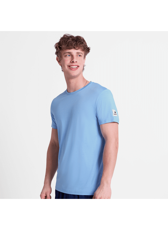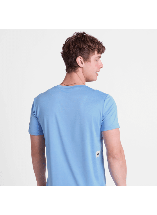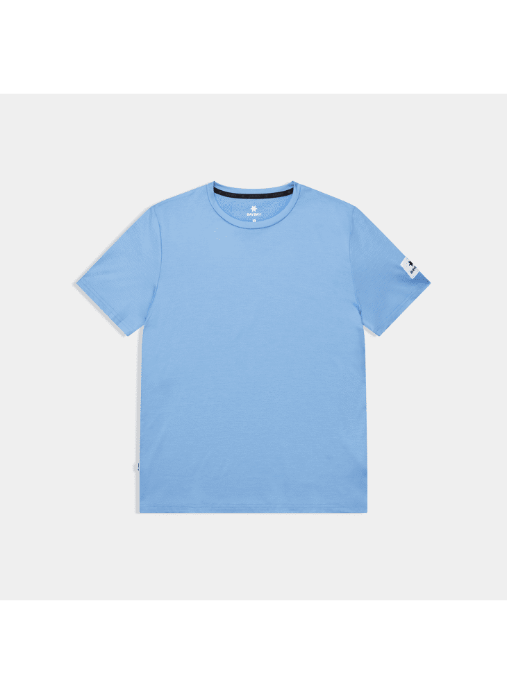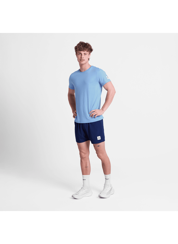 Het SAYSKY Clean Pace T-shirt is een heren t-shirt met korte mouwen in blauw gemêleerd en gemaakt van hergebruikt polyester. Het heeft een strak design en een geweven SAYSKY label op de rug en mouw in het wit. De pasvorm is normaal, met een superzachte stof en goede vochtafvoerende eigenschappen.
